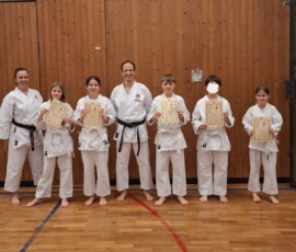 Die Mühe der vergangenen Wochen zahlte sich aus: Alle fünf Prüflinge bestanden erfolgreich ihre Gürtelprüfung zum 9. Kyu. Sie nahmen ihre Urkunden mit Stolz entgegen.
