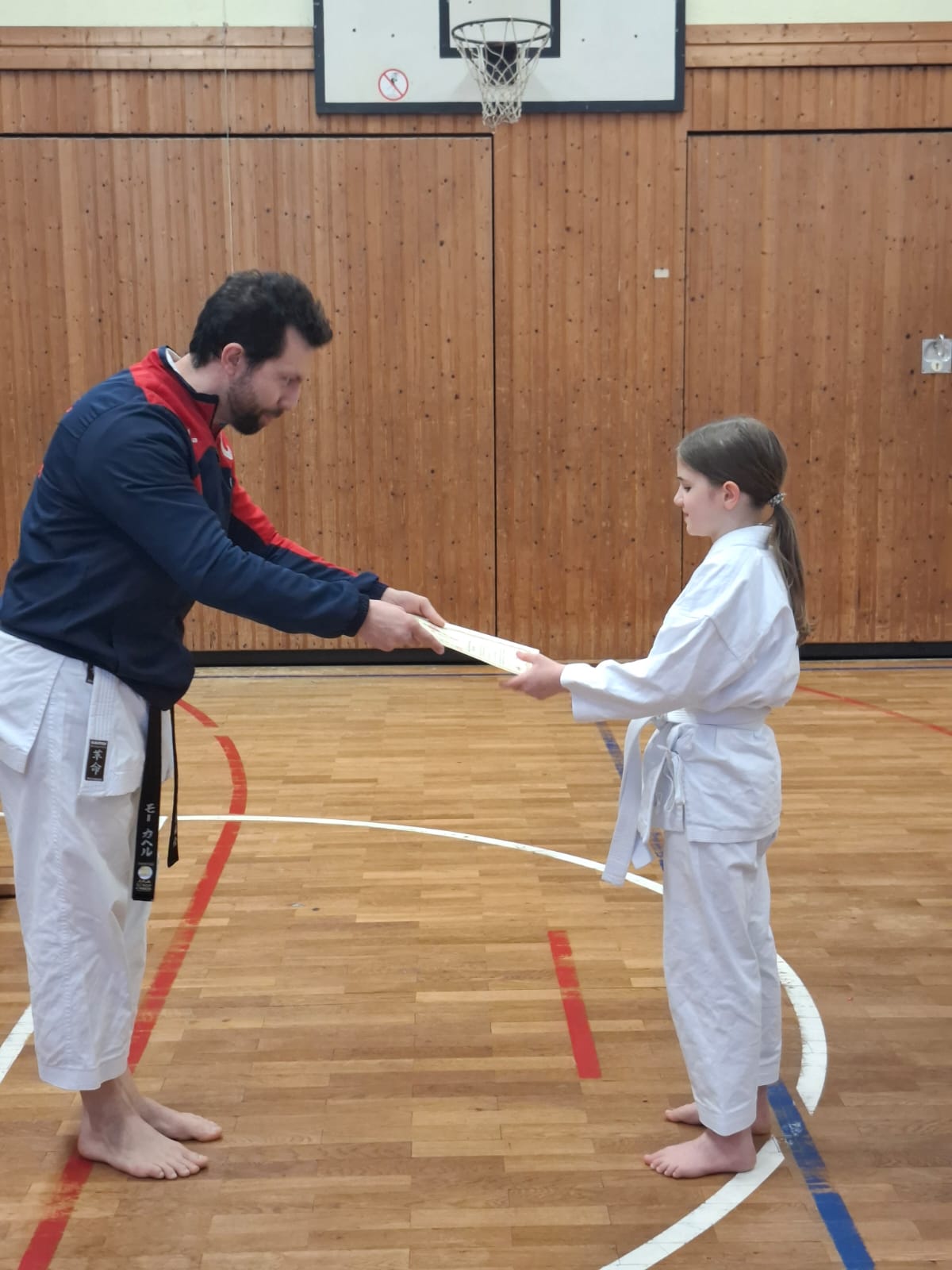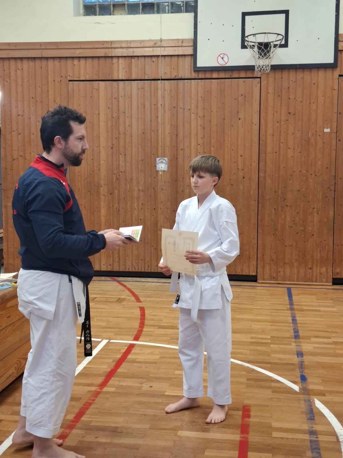 Die Mühe der vergangenen Wochen zahlte sich aus: Alle fünf Prüflinge bestanden erfolgreich ihre Gürtelprüfung zum 9. Kyu. Sie nahmen ihre Urkunden mit Stolz entgegen.